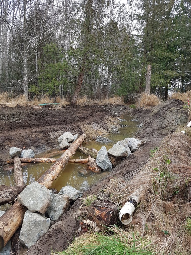 By mid January work began on the extension to the spawning channel. It was a chance to learn more about the habits and life of cutthroat. A fairly wide deep channel was dug and ground water from phase one and two connected. On both sides of the channel, shelves were shaped to support planting.