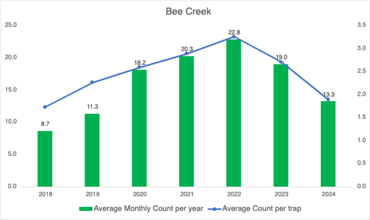 After a full six months of monitoring Bee Creek, our count shows two years in a row of dropping numbers a Cutthroat. On an average for every gee trap placed in the creek, we recorded about two trout and for each month of monitoring the average recorded dropped to around thirteen. The monthly count however ranged from 30 to a low of around five.