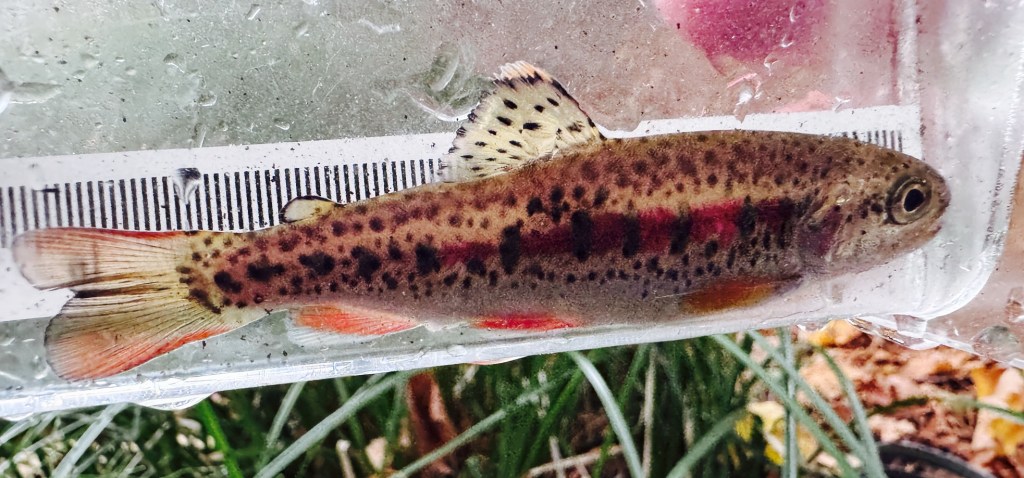 Water temperature has dropped slightly since the summer months and remains at around nine to ten degrees, as we recorded six trout in the creek. The Cutthroat remain mostly small ranging from 60 mm to the largest of 120mm.