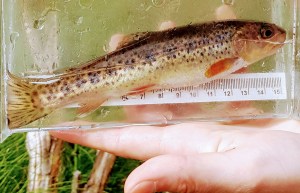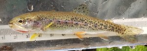 The smallest trout measured about 50 millimeters and was retrieved just below the bridge where we tried a new site. Fortunately we found three Cutthroat here. This one appears to be a year one juvenile cutthroat.
