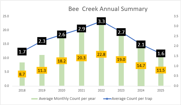 Each month during the monitoring season, seven traps are set unless monitoring is delayed. A total count of the traps is recorded and an average for the year is calculated.
